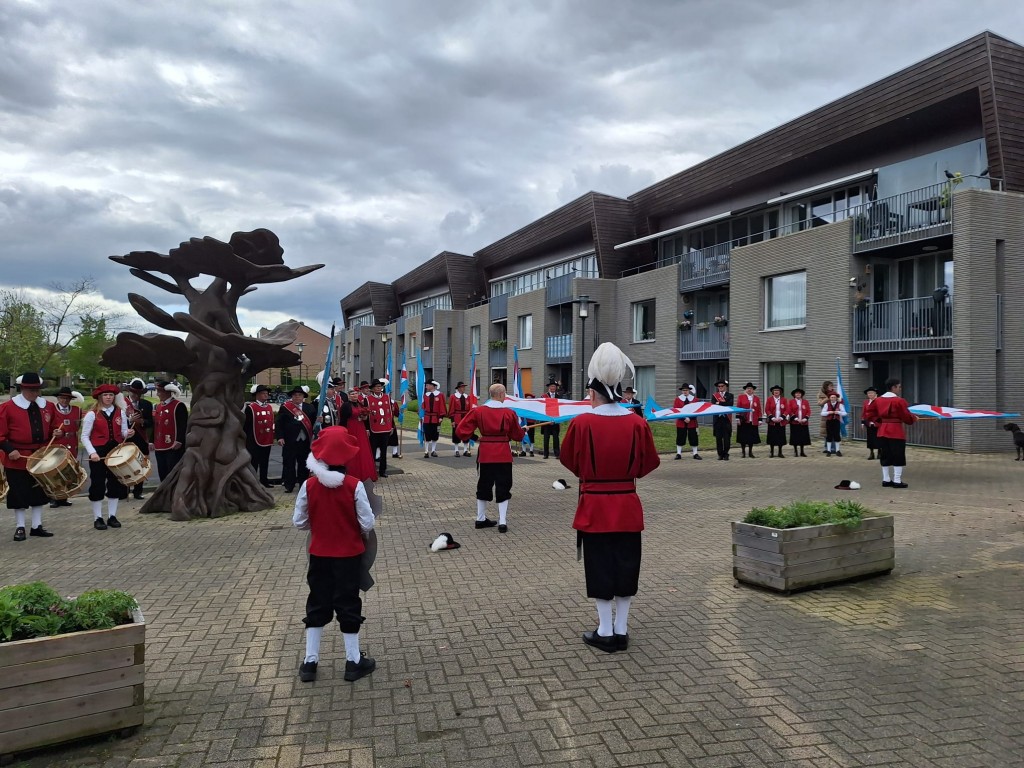 De teerdag begint met een indrukwekkende optocht naar bejaardenhuis Marishof. Onder begeleiding van onze tamboers en bazuinblazers loopt het gilde in vol ornaat – met zwarte pakken, ons koningspaar, bestuursleden, vendeliers, de jeugd en onze dames – door de straten van Maarheeze. Na ons bezoek aan Marishof keren we in optocht terug.